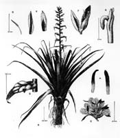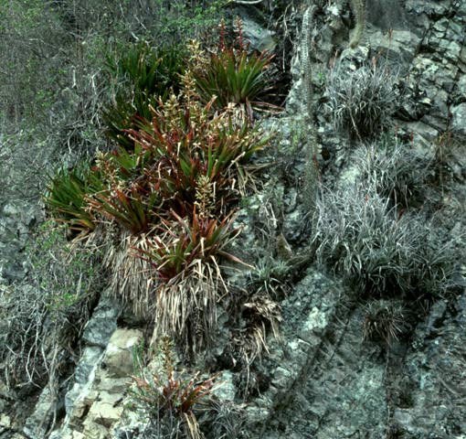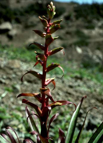 Dillon, Michael O. 1991. A new species of Bromeliaceae, Tillandsia tragophoba, is described from the Atacama Desert of northern Chile. Brittonia 43(1): 11-16. [A new species of Bromeliaceae, Tillandsia tragophoba, is described from the Atacama Desert of northern Chile. The leaves of this new species are green, essentially glabrous and form a basal tank capable of holding water, quite unlike the typical gray-leaved, terrestrial or lithophytic bromeliads usually found within the coastal desert province of western South America. A description and illustration are provided, and its relationships discussed.] Tillandsia tragophoba is based upon: Type: Chile. Antofagasta (Región II), Prov. Antofagasta, Quebrada Rinconada, ca. 5 km N of Caleta Paposo, (24°56'S, 70°30"W), 240-440 m alt., 4 Nov 1988, M. O. Dillon & D. Dillon 5869 (Holotype: SGO; isotypes: F, SEL, SSUC, US). |