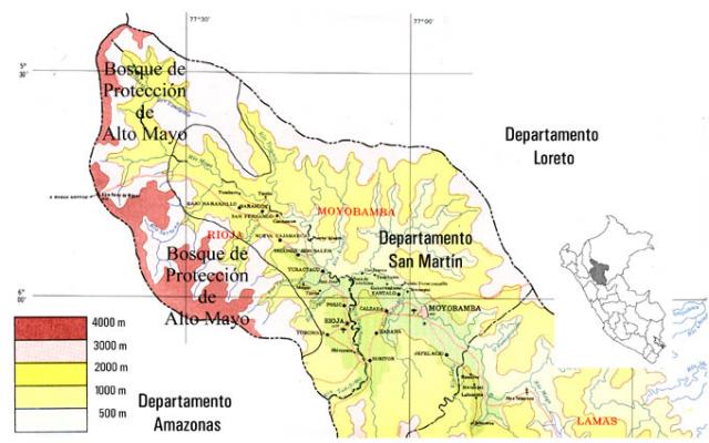 El Perú es el cuarto país más grande en América Latina (+ 1'285,000 km2) y el quinto más poblado (ca. 24'000,000 de habitantes). Debido a su posición geográfica contiene una elevada riqueza, tanto de plantas como de animales. Los procesos de documentación de la riqueza de ambientes del Perú continúan, pero recientes compilaciones de plantas, estiman que contiene no menos de 19 000 especies de plantas con flores, gimnospermas y helechos (aproximadamente 20 % de la flora de América del Sur). El Perú es ampliamente reconocido como uno de los 12 más importantes centros de origen de plantas cultivadas del mundo. Los bosques lluviosos amazónicos del Este comprenden más del 60 % del total del área del Perú y representan una importante fuente de recursos naturales. En el Departamento de San Martín, en el Nor Este del Perú, los bosques montanos elevados y la "ceja de montaña" contribuyen a formar los bosques lluviosos de las tierras bajas de la amazonía. Los bosques en esta área son llamados "selva alta" o bosques premontanos cuya altitud varia entre 500 - 1 500 m. Durante las últimas dos décadas, la población rural en el Norte Este del Perú ha crecido rápidamente y esto ha dado origen a la ocupación y explotación de los bosques no protegidos. En las regiones que han sufrido talas de bosque en grandes áreas, se ha producido erosión de suelos, deslizamientos de tierras, inundaciones y ha disminuido la provisión estacional de agua (Gentry & López Parodi, 1980). En 1986, debido al temor de que la continua tala de árboles afectara las fuentes de agua de Rioja, líderes locales de esta comunidad de San Martín solicitaron que las cabeceras de cuenca de el Río alto Mayo y sus tributarios fueran protegidos. El gobierno peruano dispuso que una considerable porción de estos bosques fueran considerados bajo el estatus de Bosque de Protección (Figura 1), área que representa a grandes rasgos, las fuentes del Río Alto Mayo en el extremo noroccidental de San Martín. Dado que la producción de arroz es uno de los renglones económicamente importantes para la región, una pérdida significativa de agua, afectaría sensiblemente la agricultura de la región. Evaluaciones para la conservación de las estribaciones orientales de los Andes del Perú han sido resumidos por Young & León 1997. Tal como ellos lo anotan, solo unas pocas localidades han sido estudiadas en detalle. Tres parques nacionales a lo largo de las estribaciones de los Andes orientales han sufrido tala indiscriminada. Claramente, la designación del Bosque del Alto Mayo como zona protegida, no ha cumplido la función de salvar el bosque y su biodiversidad. |